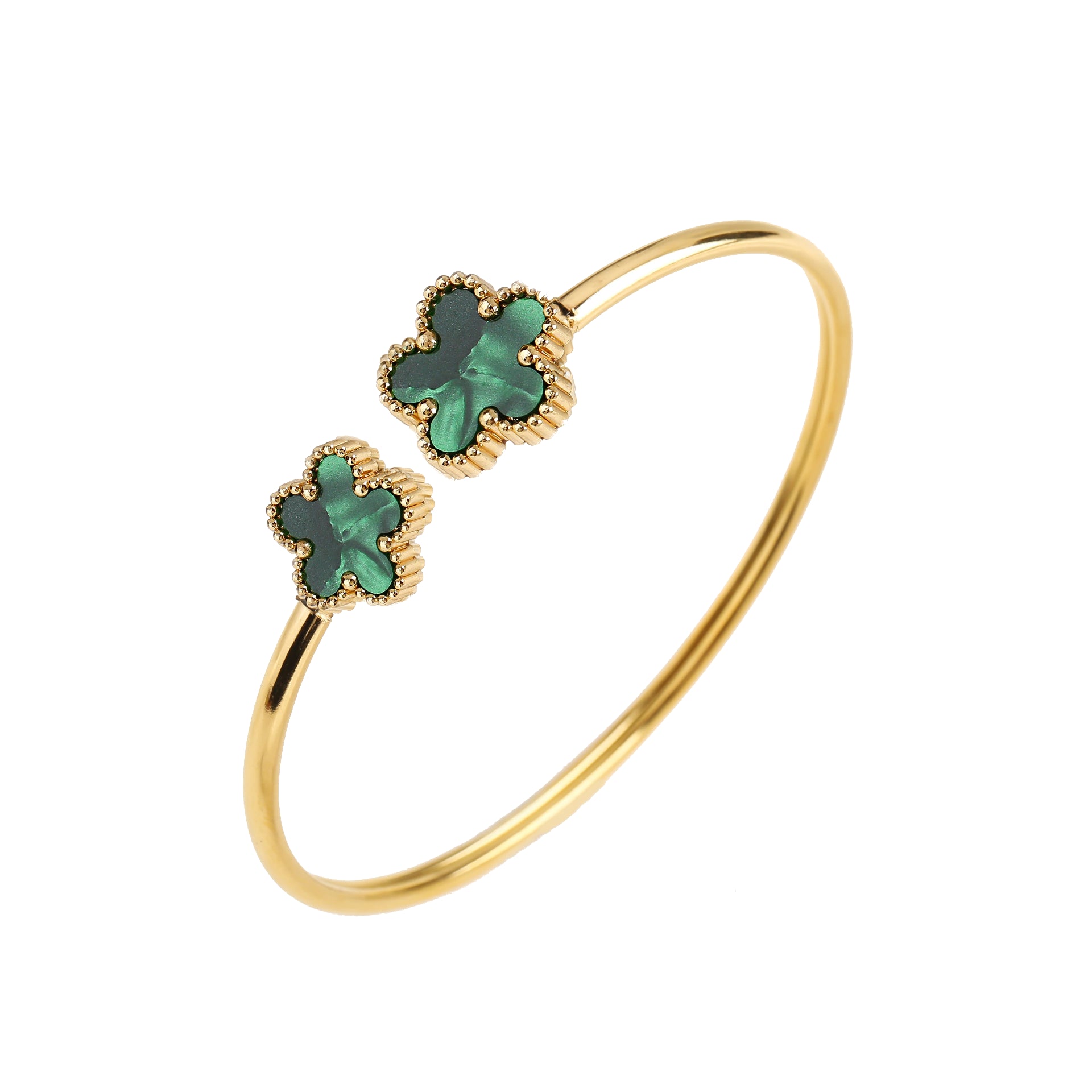 Brazalete Abierto con Detalle de Flor Verde en Oro