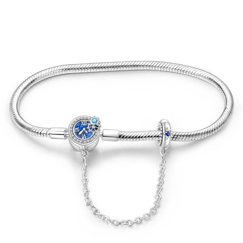 Este brazalete con un pequeño reloj y detalle azul es un detalle especial para celebrar el valor de cada instante. Elaborado en plata 925, su diseño combina un reloj decorativo con un toque de zirconia cúbica azul, evocando elegancia y serenidad. Es el complemento ideal para un look sofisticado o para añadir un toque único a tu día. Perfecto para regalar a alguien que aprecia el tiempo o llevarlo como un recordatorio de vivir el momento. Su estilo flexible se adapta cómodamente a tu muñeca.