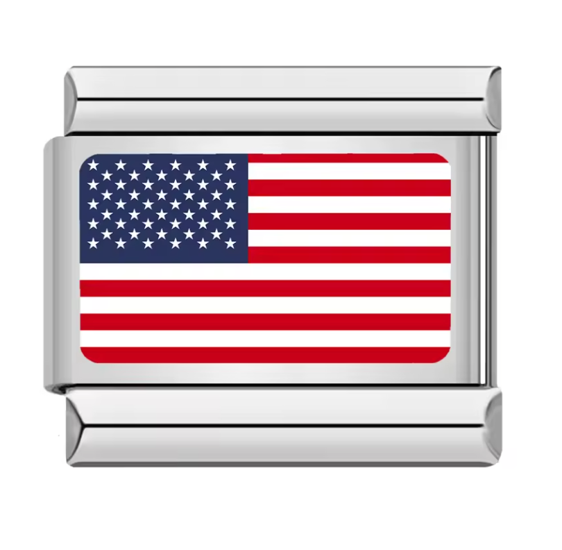 Este charm italiano con diseño de la bandera de Estados Unidos es una pieza elegante que simboliza el orgullo nacional. Fabricado con materiales de alta calidad, presenta las icónicas estrellas y franjas en rojo, blanco y azul, representando libertad y unidad. Ideal para personalizar pulseras o collares, es perfecto para quienes desean llevar su herencia estadounidense o celebrar su cultura en cualquier ocasión. Su diseño duradero y versátil lo hace adecuado para uso diario o como regalo significativo.