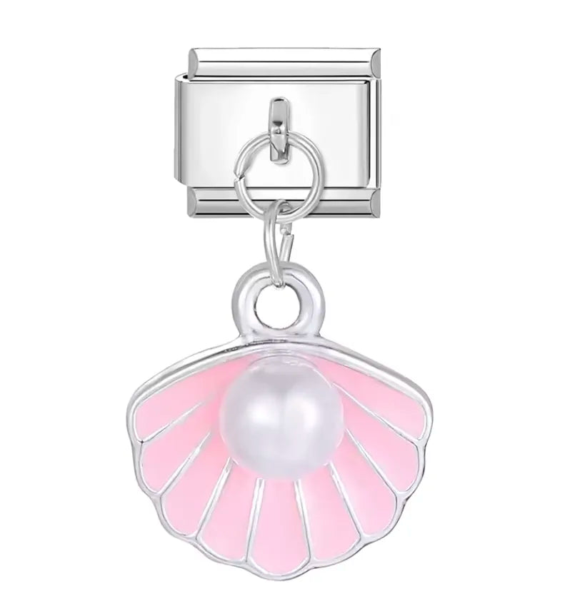 Este charm italiano con colgante de perla en concha rosada es una pieza elegante que combina delicadeza y sofisticación. Fabricado con materiales de alta calidad, presenta una concha rosada brillante con una perla central, todo sobre un fondo plateado, simbolizando pureza y elegancia natural. Ideal para personalizar pulseras o collares, es perfecto para quienes buscan un accesorio versátil con un toque marino y lujoso. Su diseño duradero y refinado lo hace adecuado para uso diario o como regalo especial.
