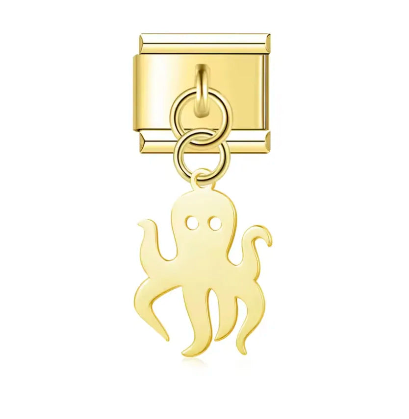 Este charm italiano dorado con colgante de pulpo es una pieza elegante que simboliza misterio y adaptabilidad. Fabricado con materiales de alta calidad, presenta un pulpo estilizado en tonos dorados, evocando la profundidad del océano. Ideal para personalizar pulseras o collares, es perfecto para quienes buscan un accesorio versátil con un toque marino. Su diseño duradero y refinado lo hace adecuado para uso diario o como regalo especial.