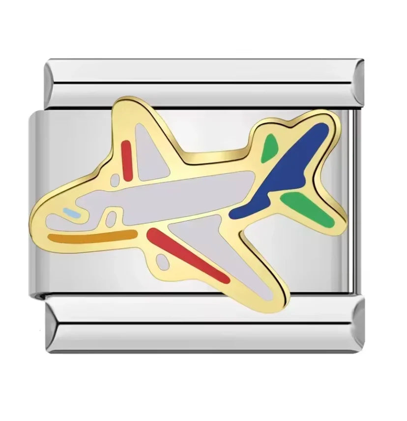 Este charm italiano plateado con diseño de avión es una pieza elegante que simboliza aventura y libertad. Fabricado con materiales de alta calidad, presenta un avión estilizado en tonos plateados, evocando el espíritu de los viajes y la exploración. Ideal para personalizar joyas, es perfecto para quienes buscan un accesorio versátil con un toque moderno. Su diseño duradero y refinado lo hace adecuado para uso diario o como regalo especial.