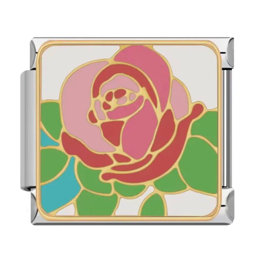Este encantador charm italiano presenta un diseño de rosa en tonos rosados, verdes y azules, elaborado con un estilo de vitral que resalta su elegancia. Perfecto para personalizar tu joyería.